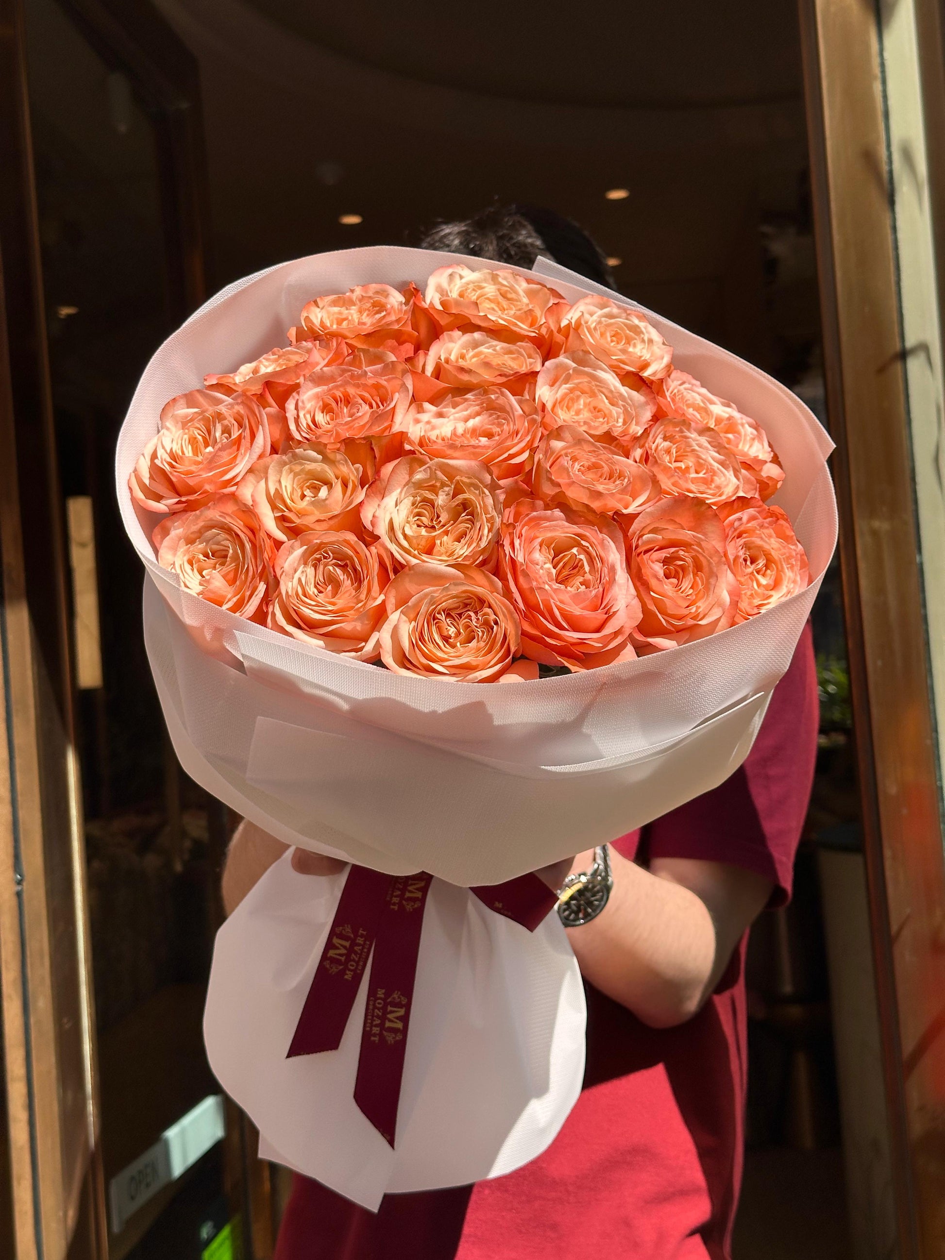 A symphony of elegance: twenty lush garden roses in a radiant peach-apricot shade, each bloom opening into layers of delicate petals. Hand-tied in Mozart’s signature wrapping with our burgundy ribbon, this bouquet embodies timeless romance and modern luxury. Perfect for anniversaries, birthdays, or simply to say “you deserve beauty today.”